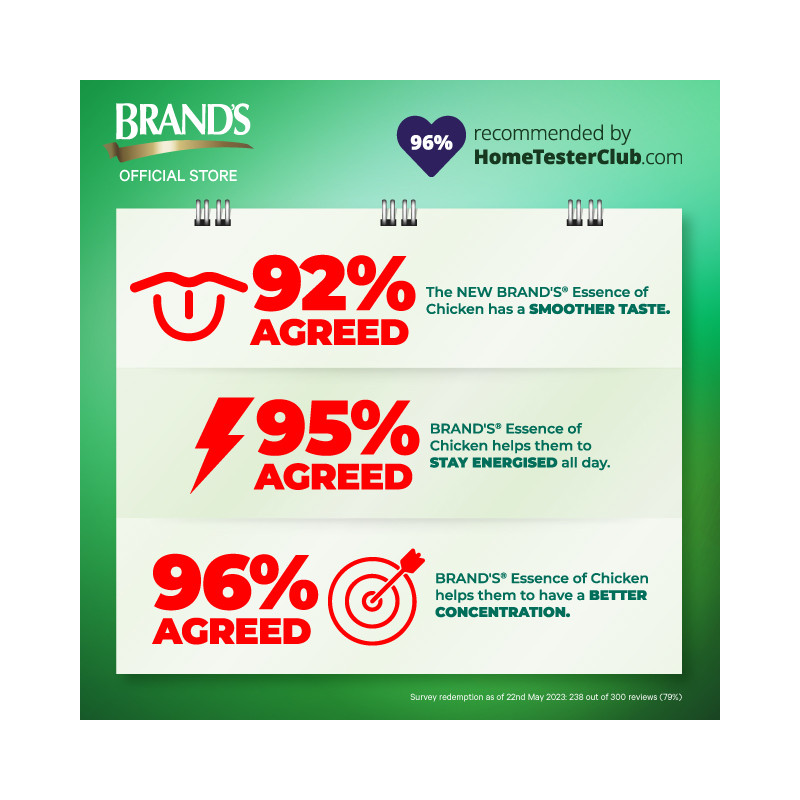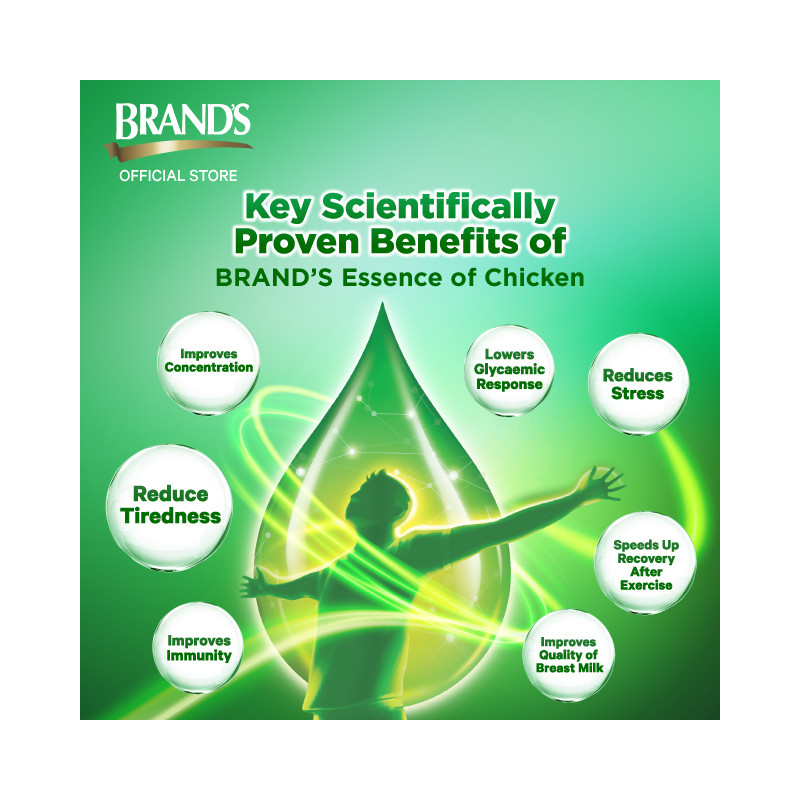 The BRAND'S® legacy started in year 1835 when Henderson William Brand, the royal chef of Buckingham Palace London, created a fat-free, easily digested chicken consomme that later became a huge commercial success widely recognized as BRAND'S® Essence of Chicken. For over 170 years, BRAND'S® Esssence of Chicken has been widely trusted all over the world for generations. BRAND'S® Essence of Chicken is the only essence of chicken in the market with extensive R&D that has produced more than 20 published scientific papers proving its efficacy. The findings show that consuming BRAND'S® Essence of Chicken improves mental concentration and memory, a fact concurred and supported by independent scientists.