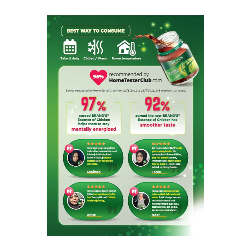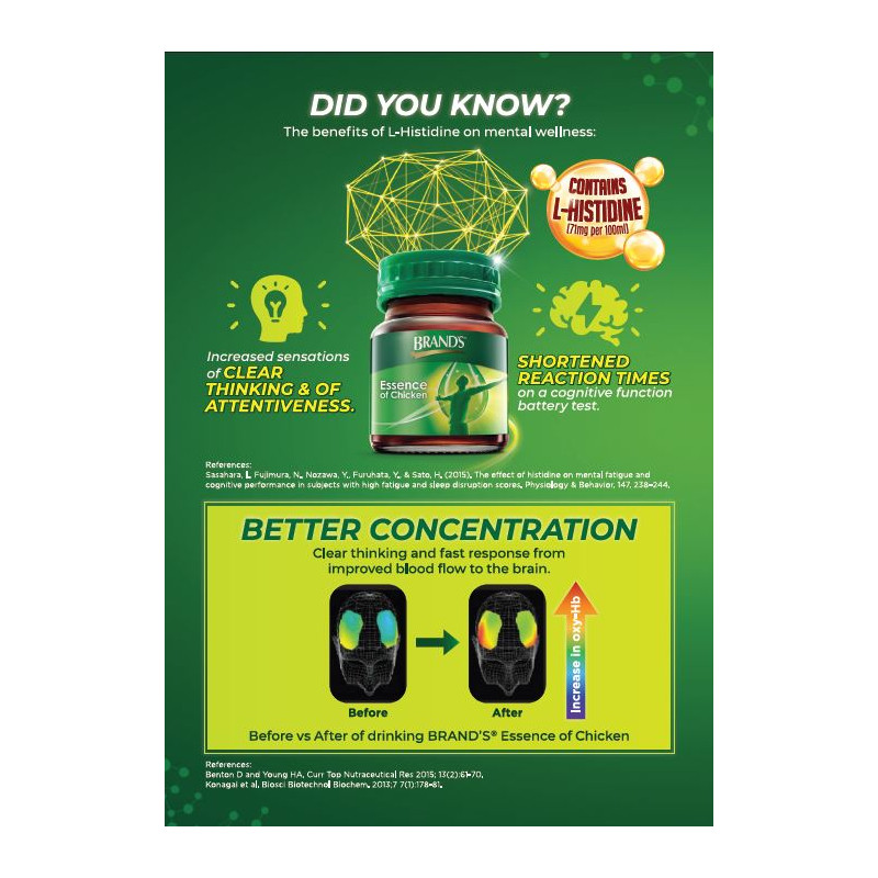 The BRAND'S® legacy started in year 1835 when Henderson William Brand, the royal chef of Buckingham Palace London, created a fat-free, easily digested chicken consomme that later became a huge commercial success widely recognized as BRAND'S® Essence of Chicken. For over 170 years, BRAND'S® Esssence of Chicken has been widely trusted all over the world for generations. BRAND'S® Essence of Chicken is the only essence of chicken in the market with extensive R&D that has produced more than 20 published scientific papers proving its efficacy. The findings show that consuming BRAND'S® Essence of Chicken improves mental concentration and memory, a fact concurred and supported by independent scientists.